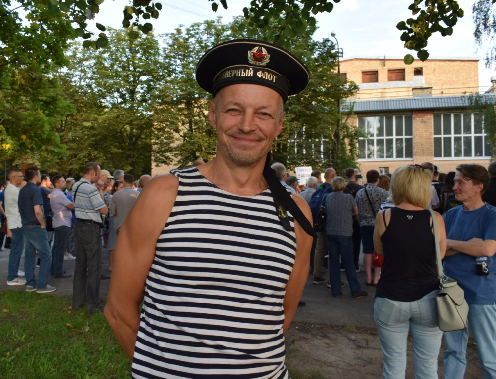 На фото: бывший боевой пловец Северного флота в День Военно-морского флота прибыл на митинг в тельняшке и бескозырке.